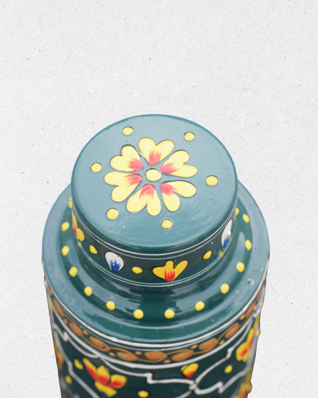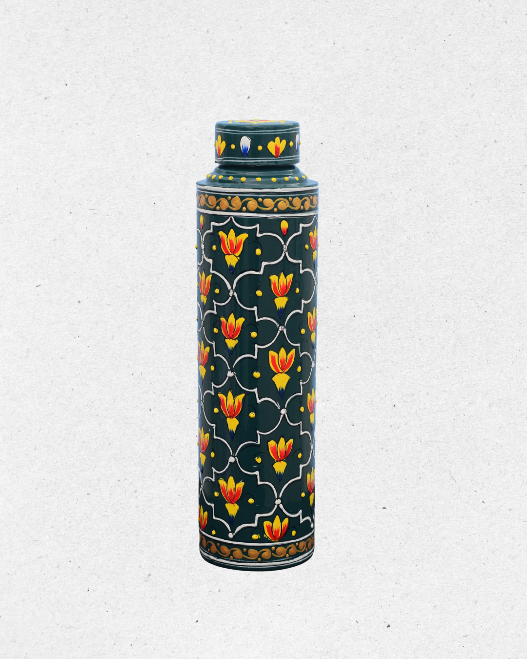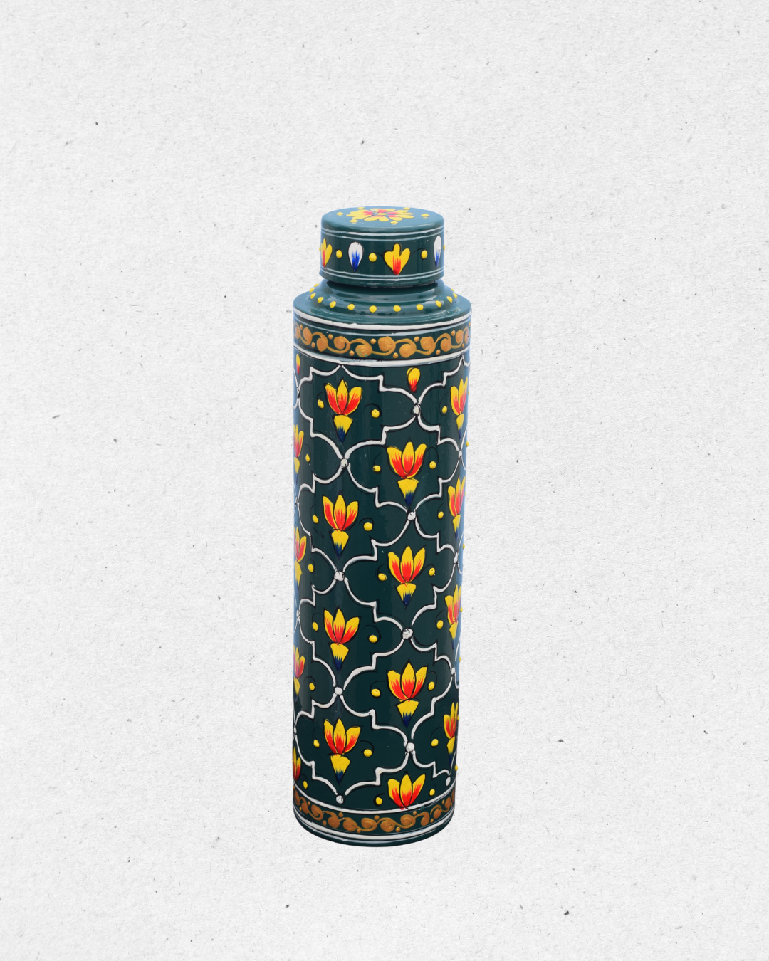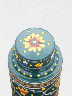Bring home the charm of timeless artistry with this Hand-Painted Green Floral Bottle. Featuring a rich emerald green base, it is beautifully adorned with vibrant red and yellow lotus-inspired motifs framed in intricate patterns. The detailed golden and white accents add a regal touch, making it a perfect blend of tradition and elegance.