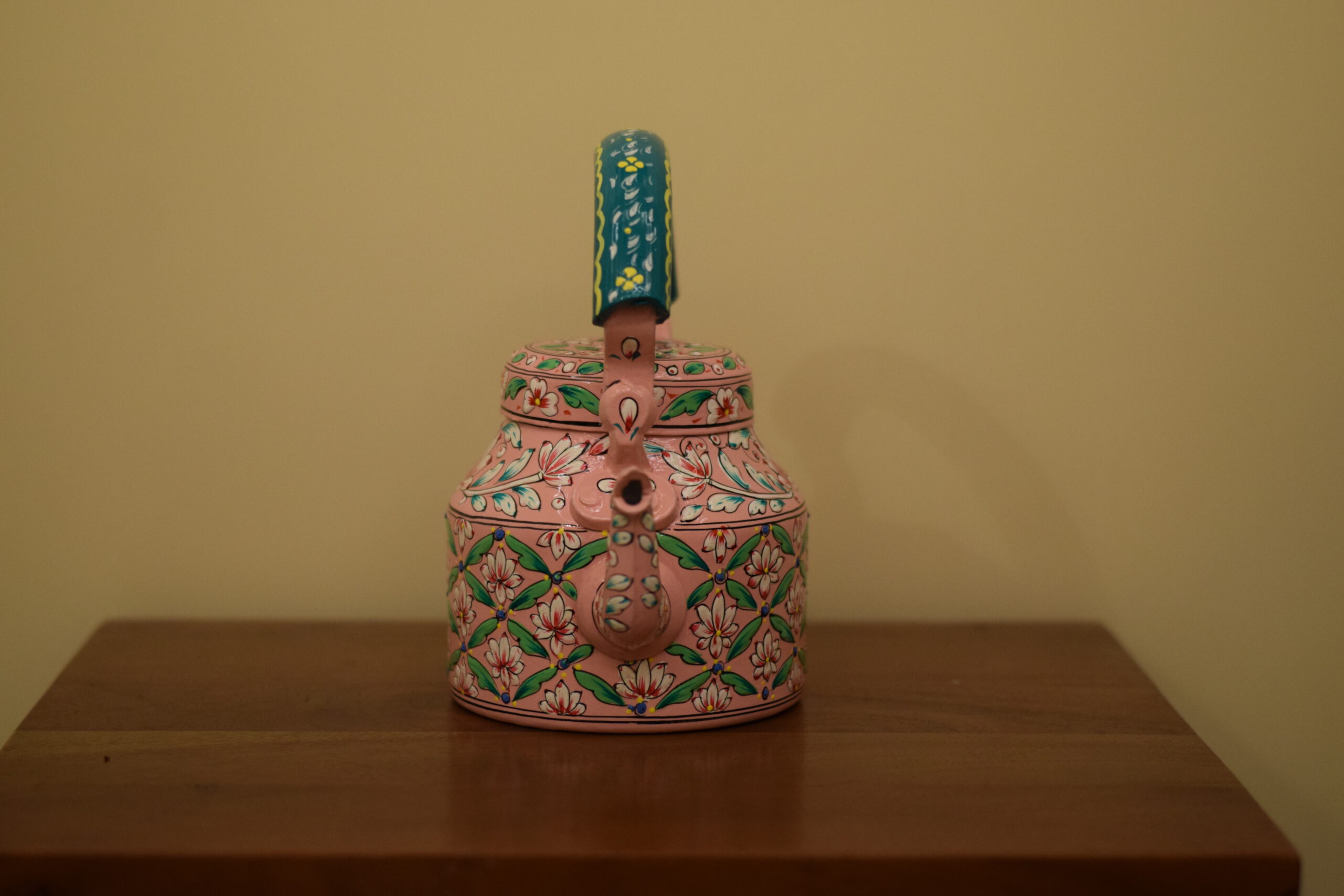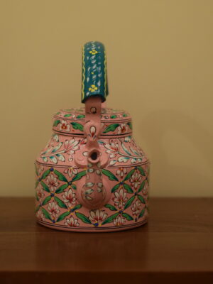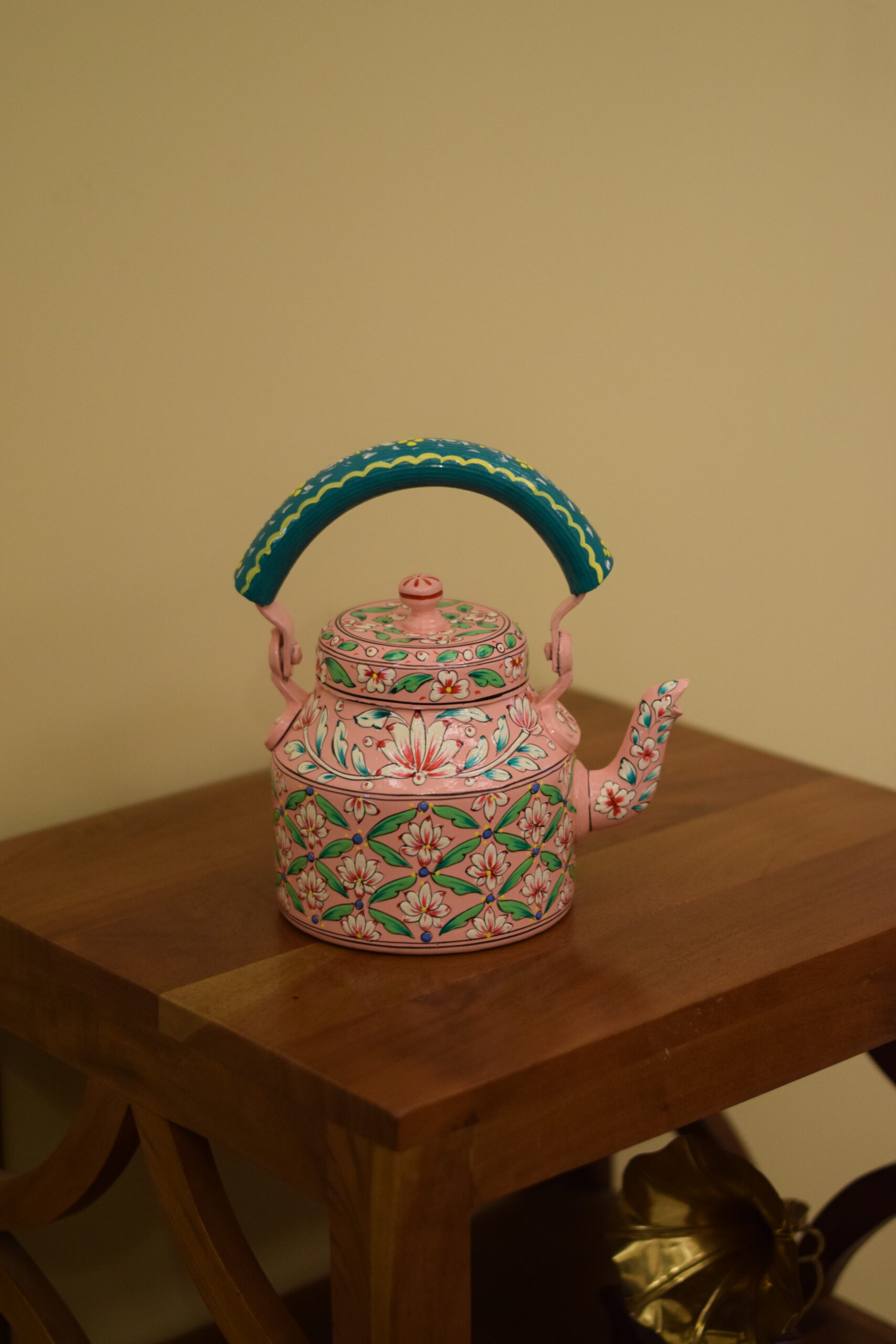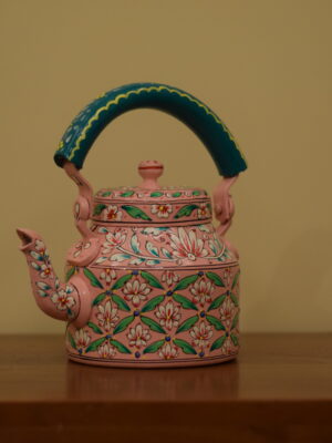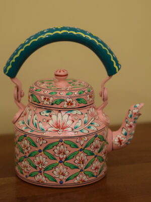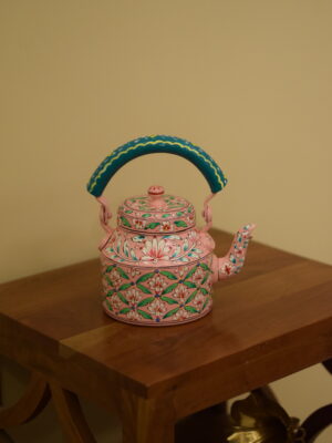 Add a vibrant charm to your home with this beautifully hand-painted kettle. Crafted with precision by skilled artisans, it features an elegant pink base adorned with intricate floral patterns in white, green, and blue, highlighted with fine detailing. The bold green handle adds a striking contrast, making this kettle a unique statement piece.