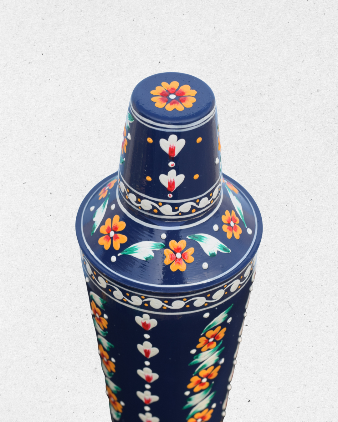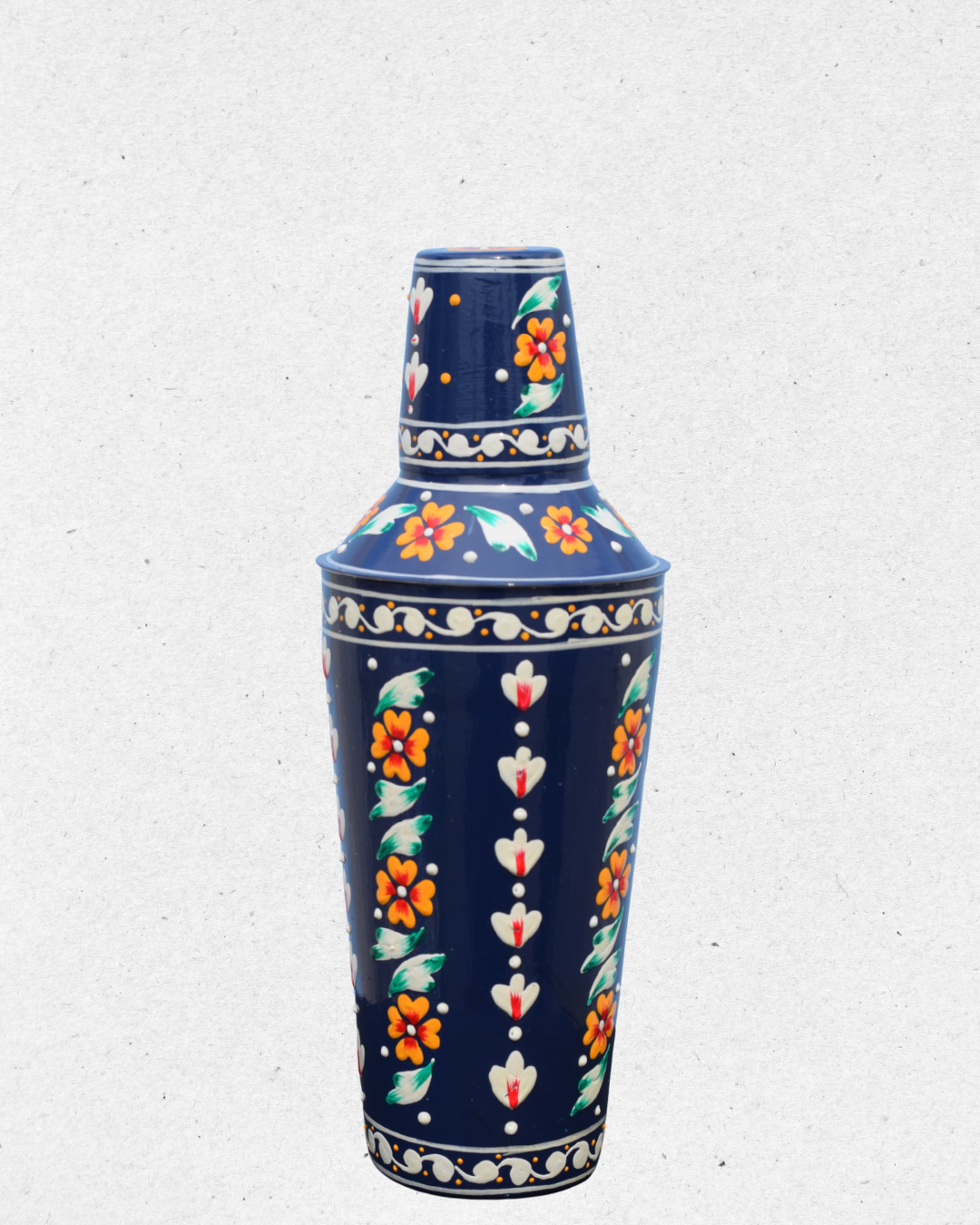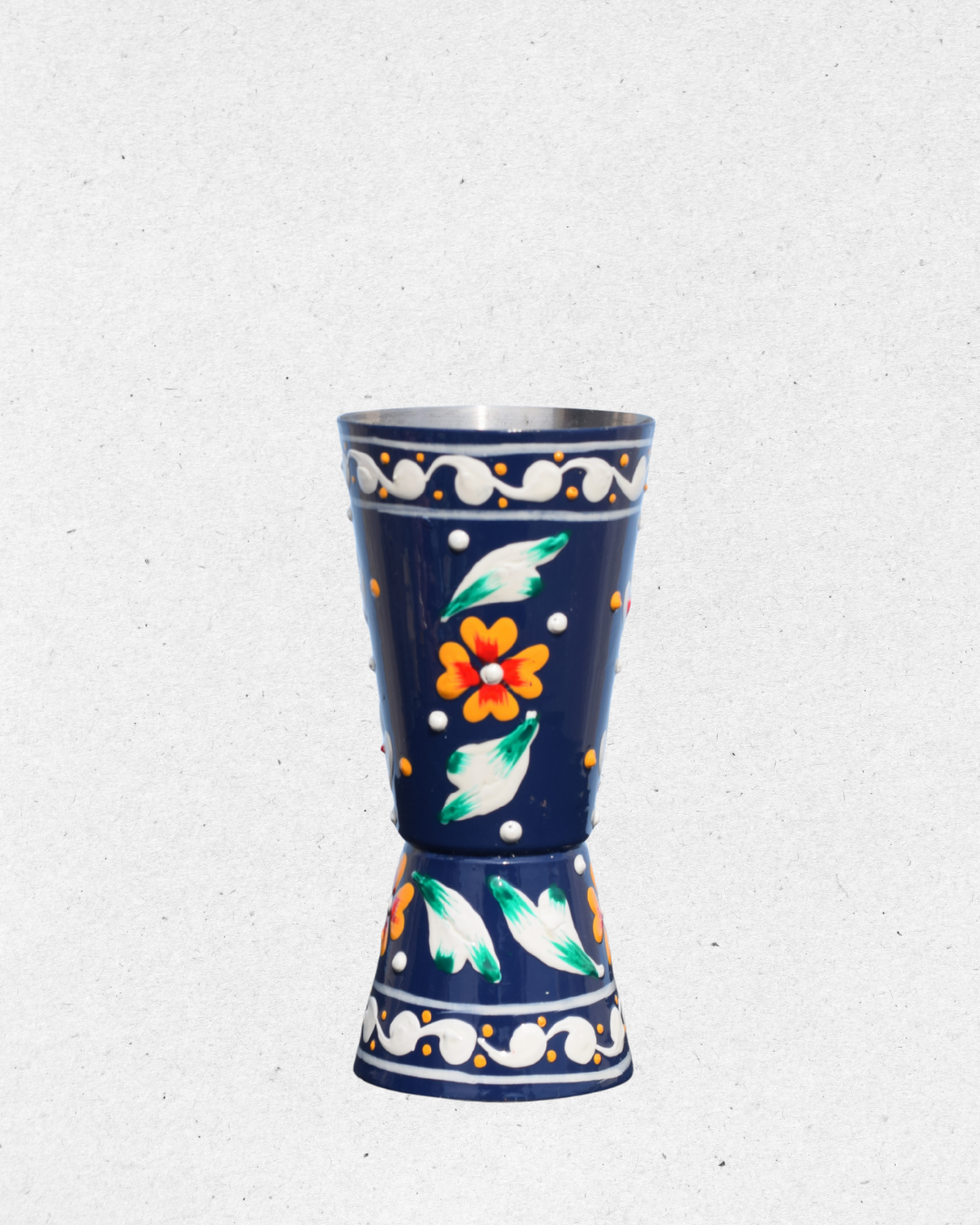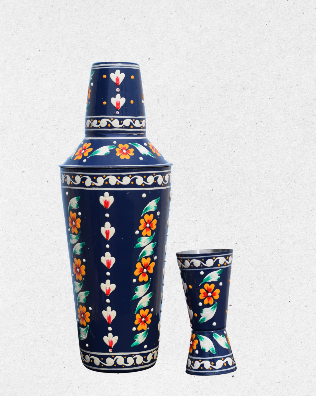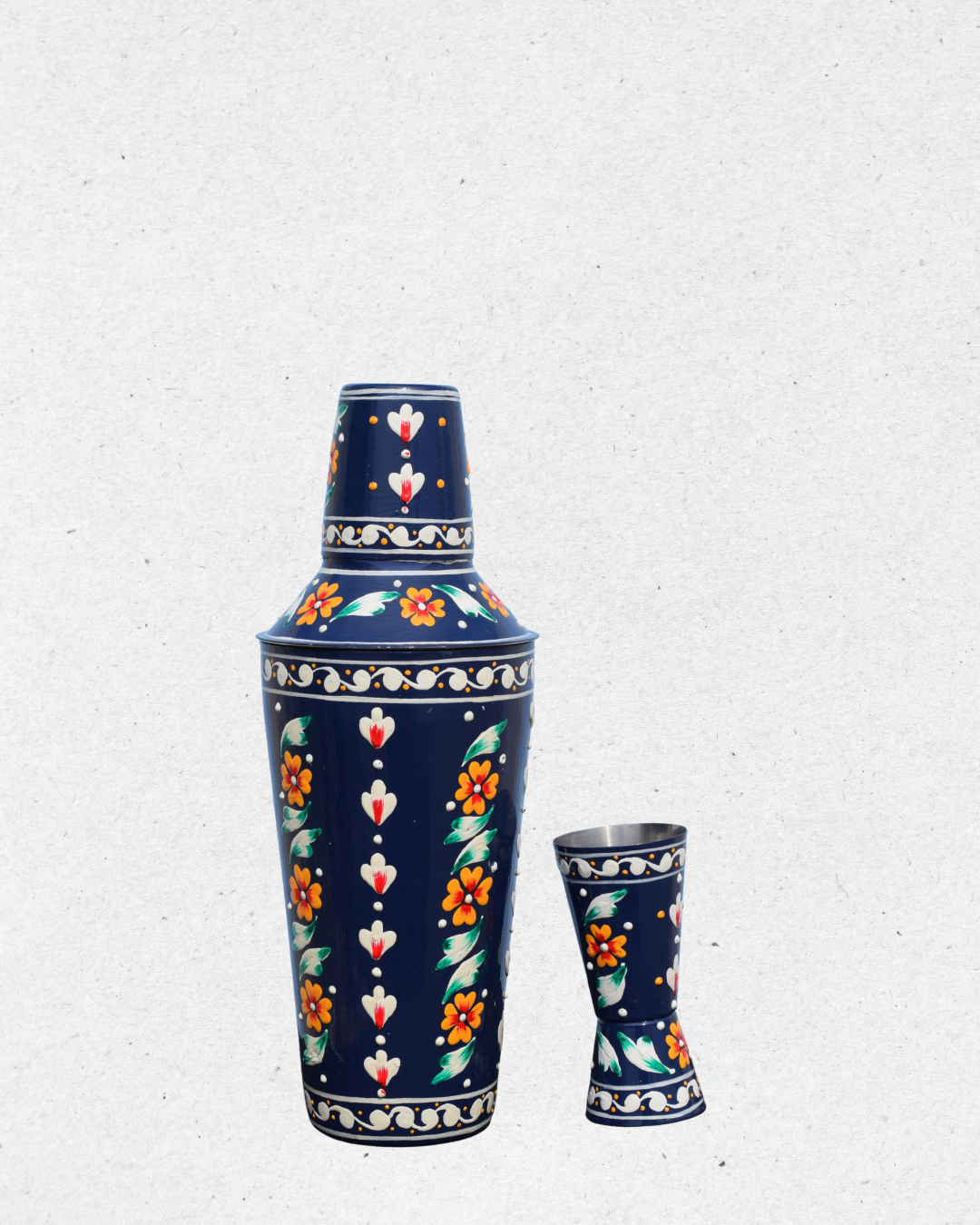 Shake, stir, and serve in style with this Inticate Floral Blue Hand Painted Shaker & Peg Measure. Made of sturdy stainless steel and hand-painted with vibrant floral motifs on a rich navy blue background, this bar set adds a splash of art and tradition to your drink-making.