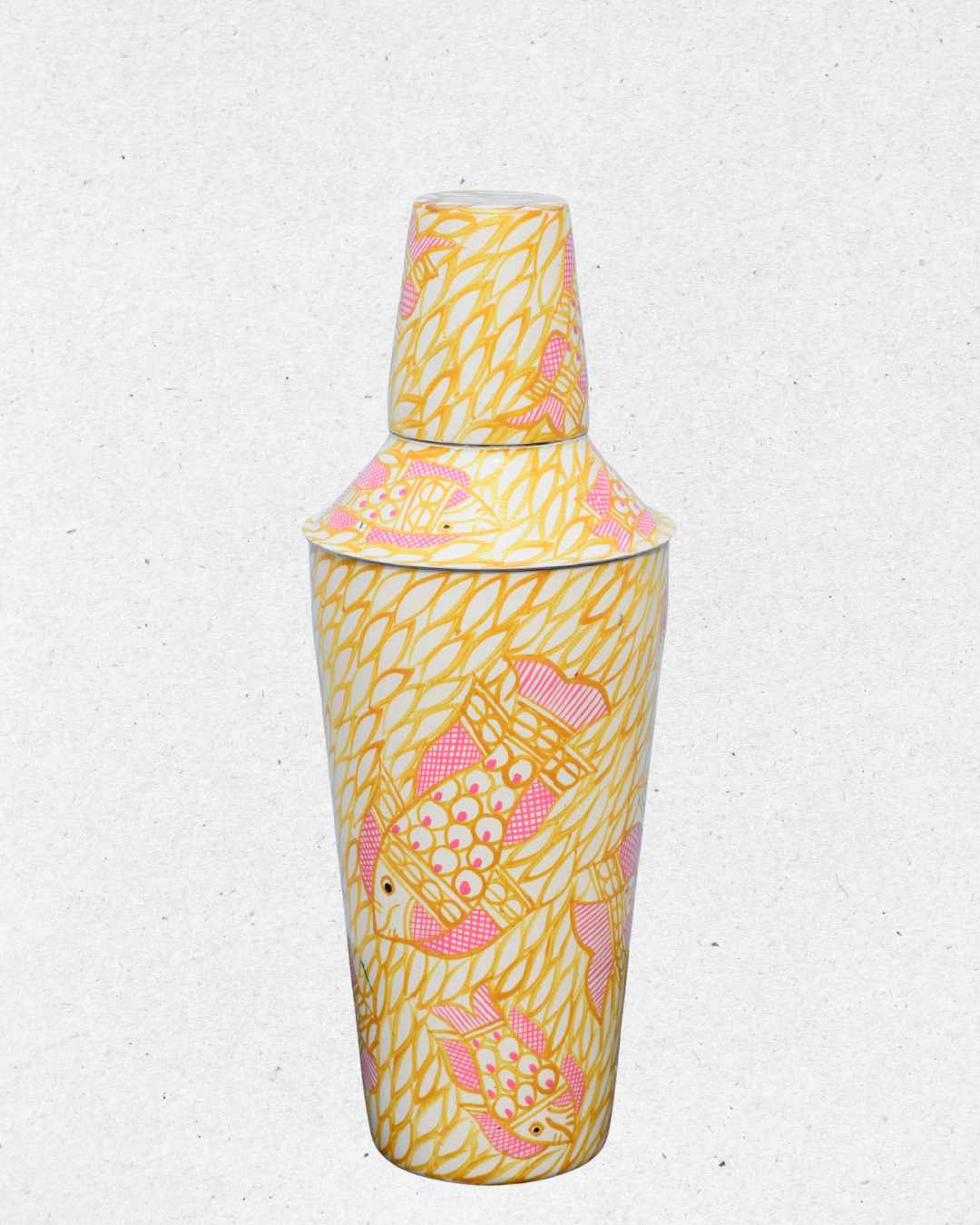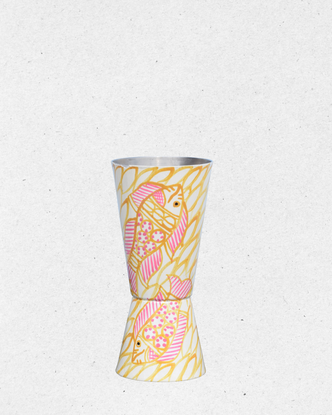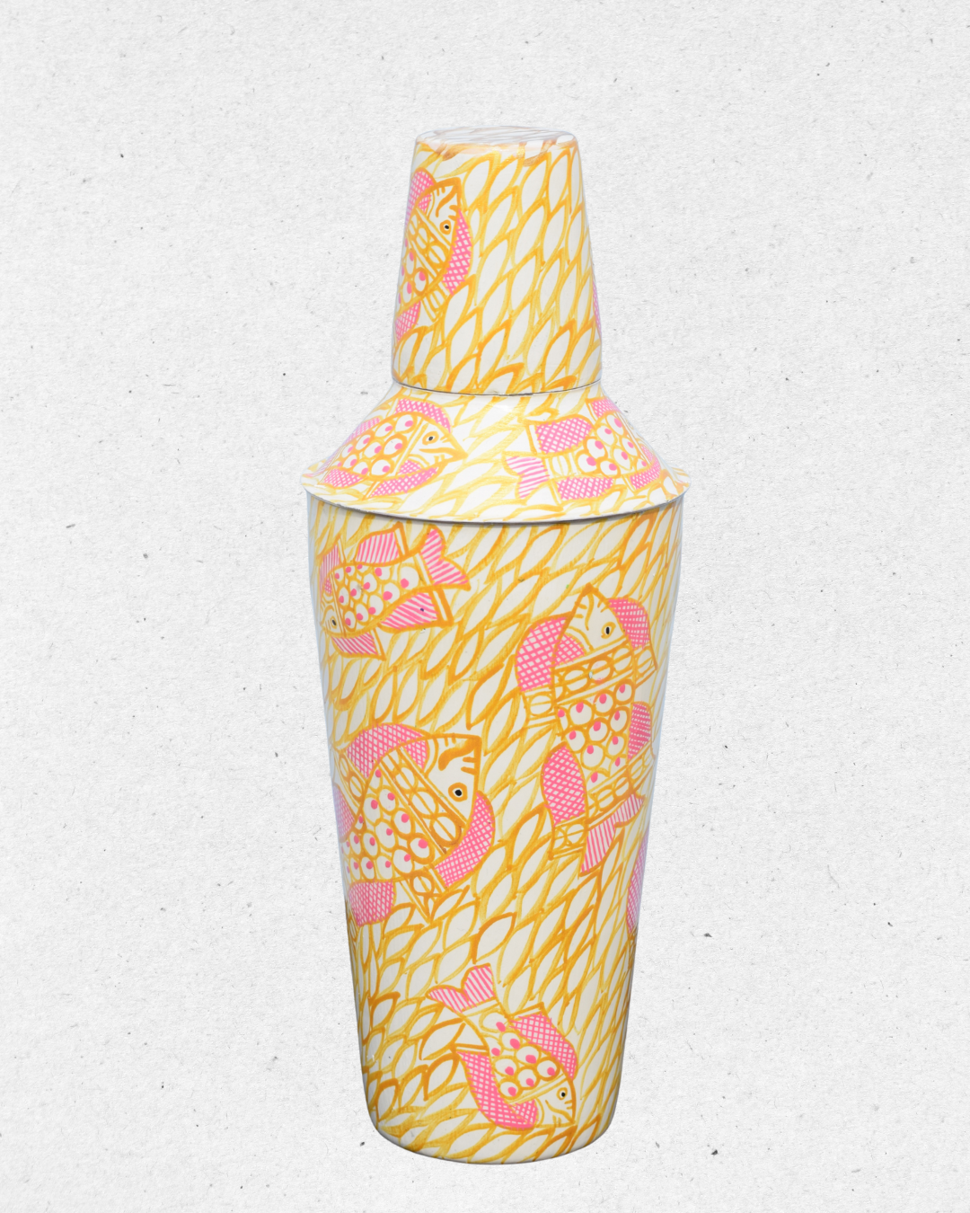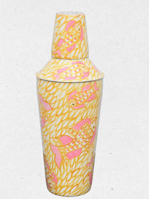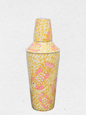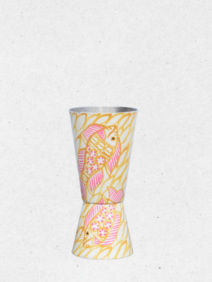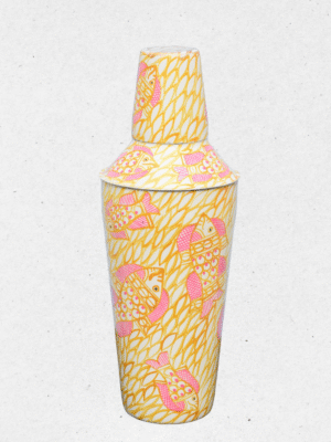 Add a splash of creativity to your barware collection with this unique shaker and peg measure set. Featuring a lively hand-painted design of pink fish swimming across a yellow leafy background, this set brings a playful yet elegant charm.