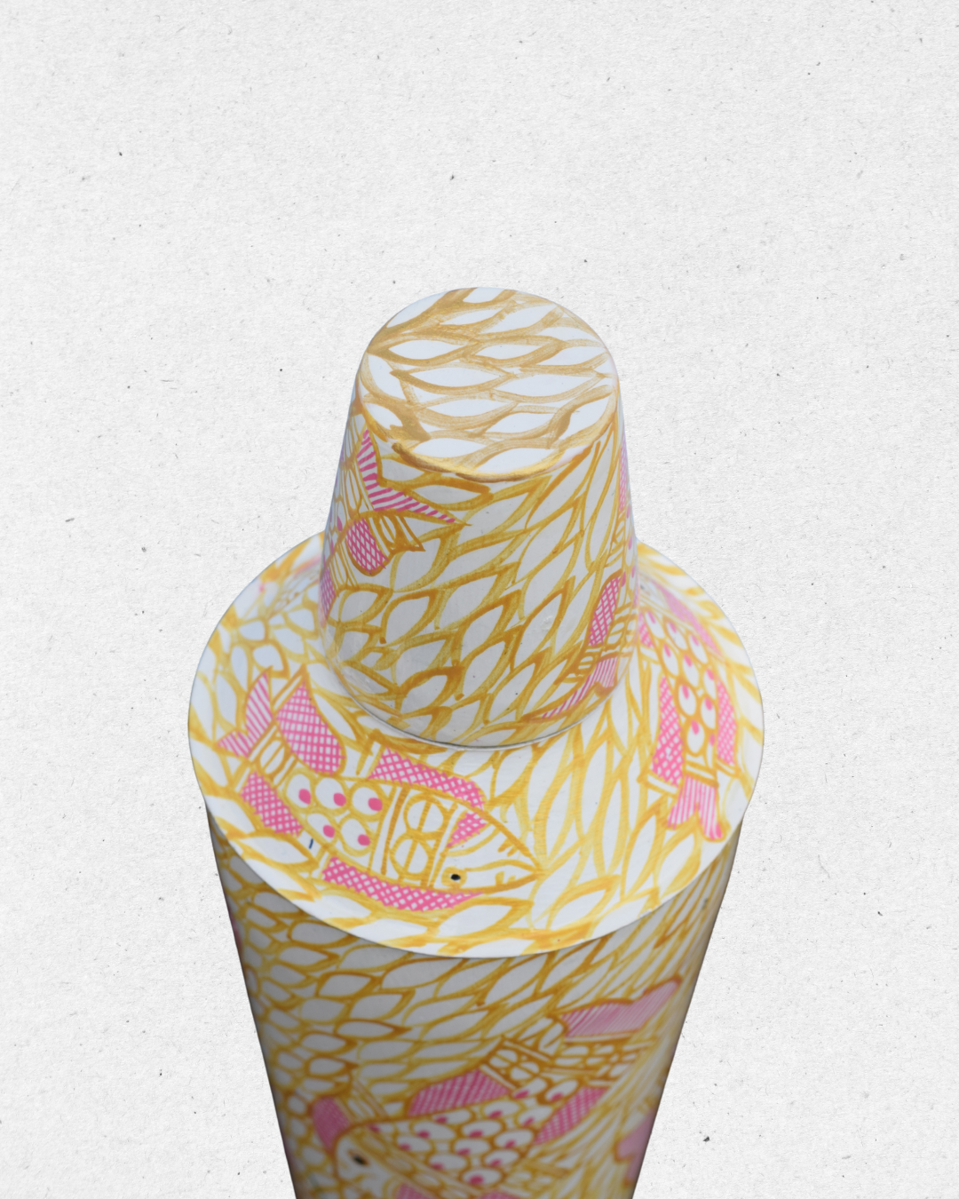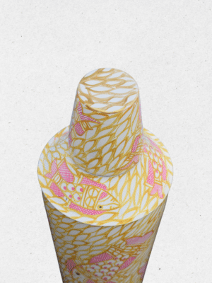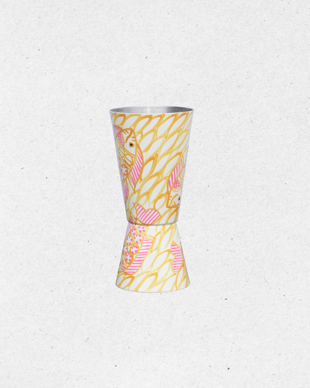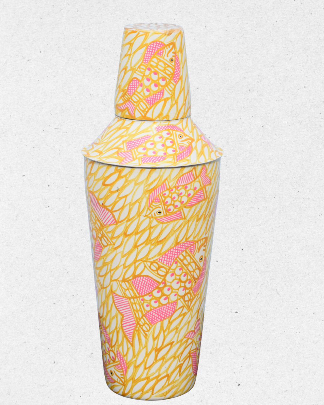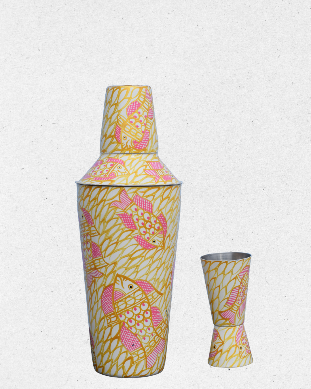 Add a splash of creativity to your barware collection with this unique shaker and peg measure set. Featuring a lively hand-painted design of pink fish swimming across a yellow leafy background, this set brings a playful yet elegant charm.