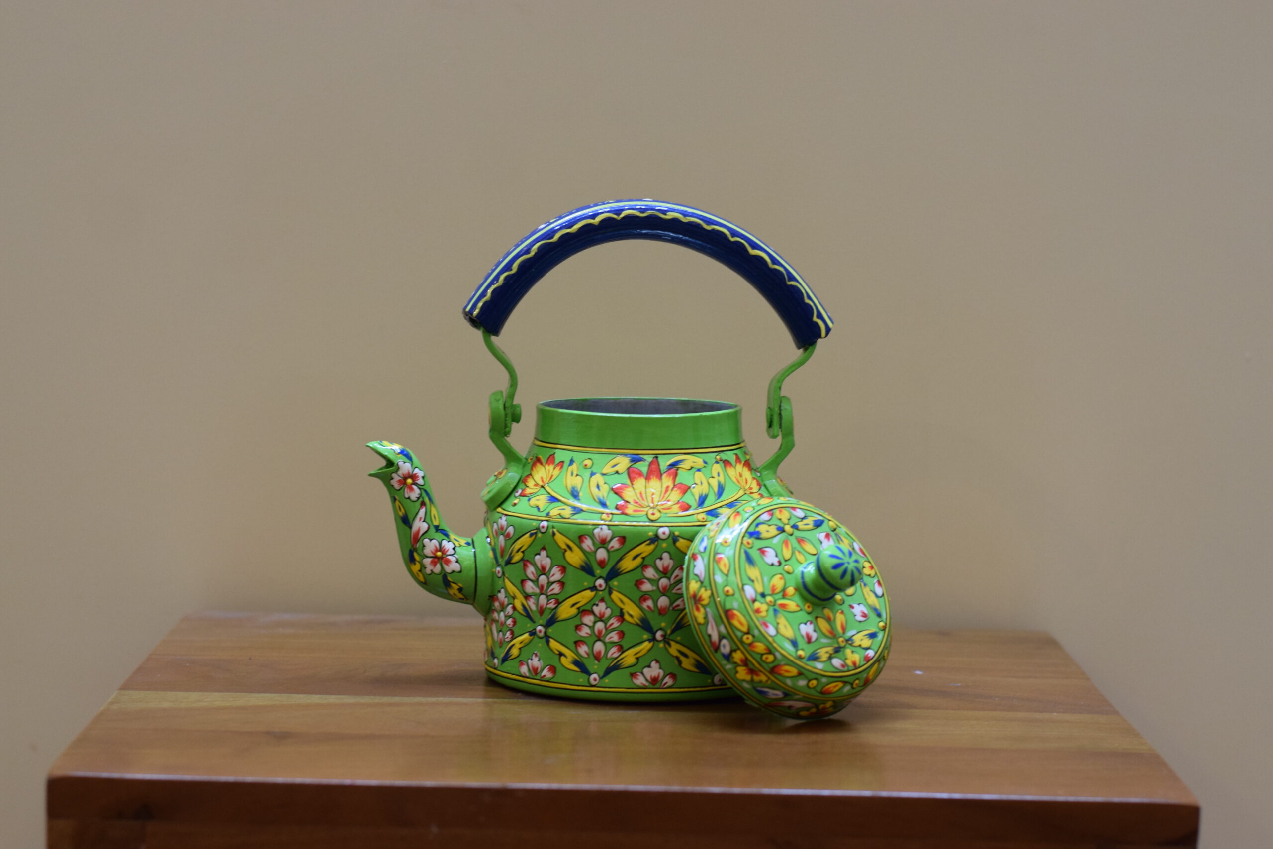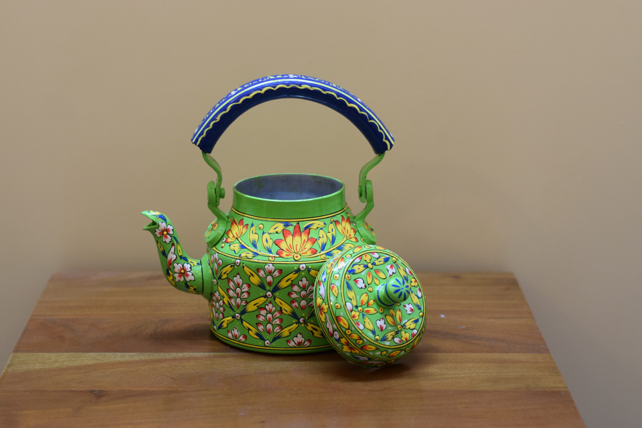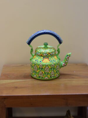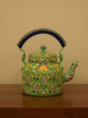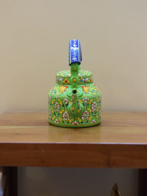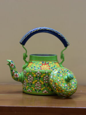 Infuse your space with color and tradition with this stunning hand-painted kettle. Featuring a lively green base, it is beautifully adorned with intricate floral motifs in red, white, and yellow, accented with fine detailing that showcases the artistry of Indian craftsmanship. The bold blue handle adds a striking contrast, making this kettle a true eye-catching centerpiece.