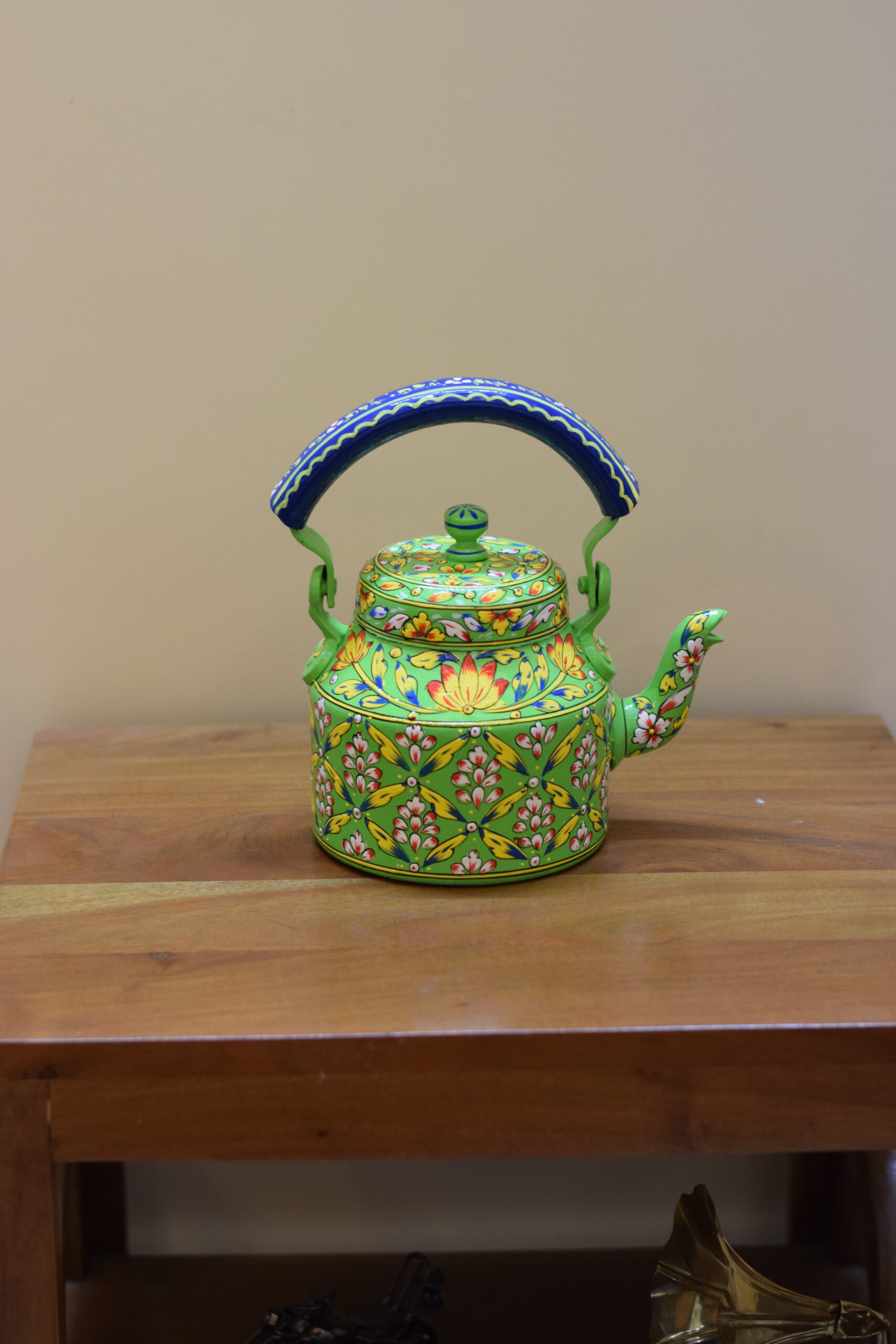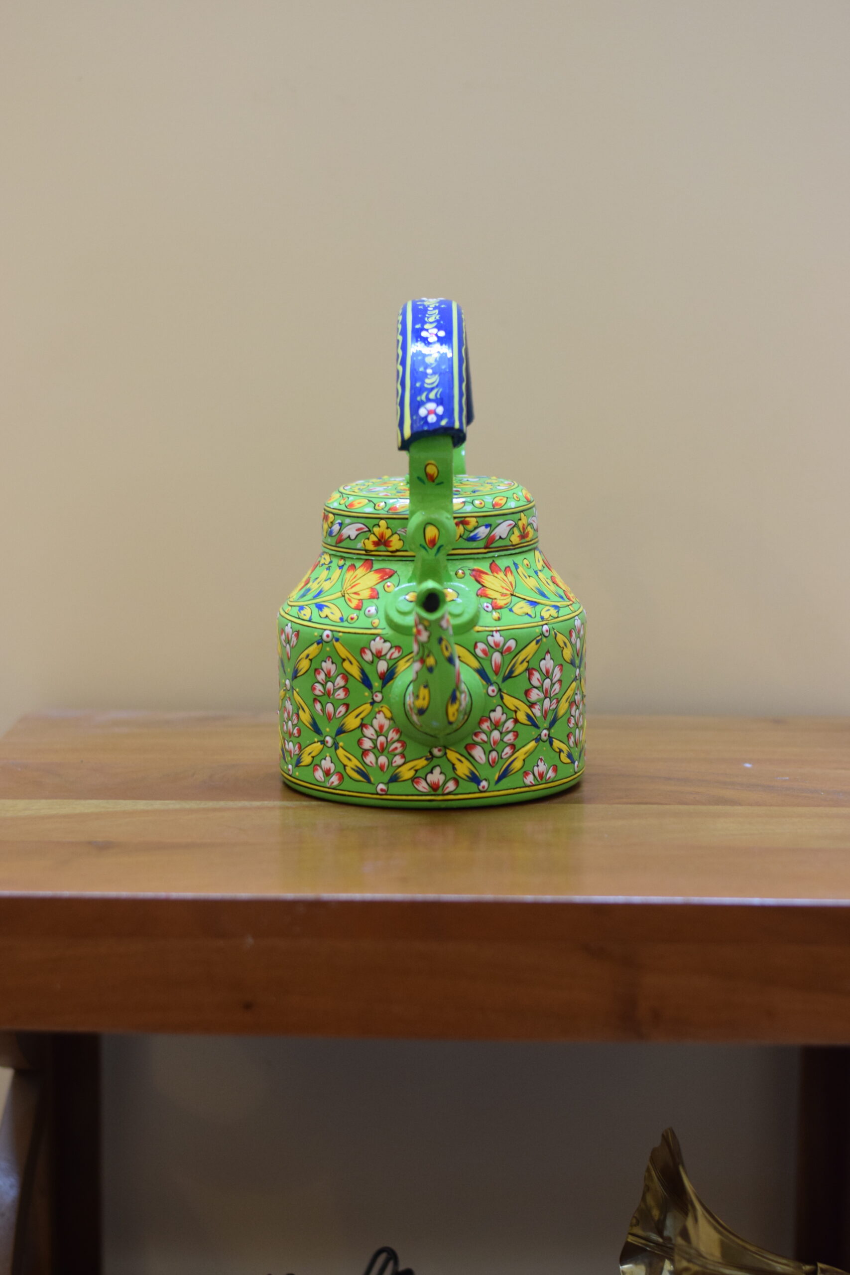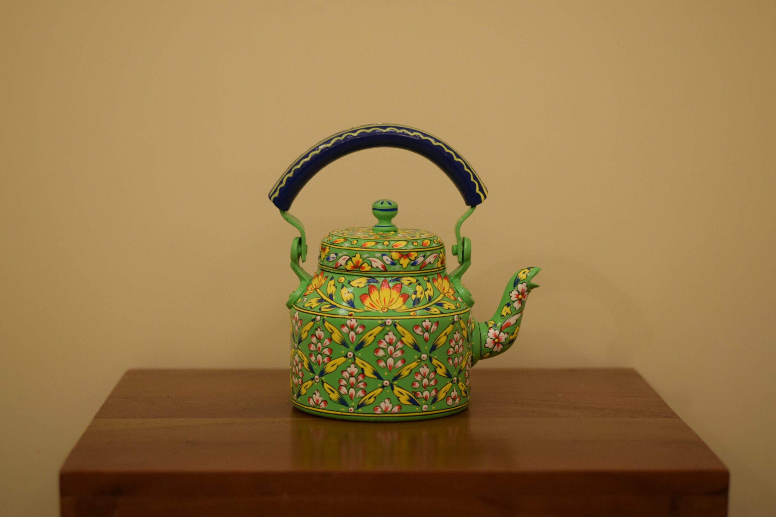 Infuse your space with color and tradition with this stunning hand-painted kettle. Featuring a lively green base, it is beautifully adorned with intricate floral motifs in red, white, and yellow, accented with fine detailing that showcases the artistry of Indian craftsmanship. The bold blue handle adds a striking contrast, making this kettle a true eye-catching centerpiece.